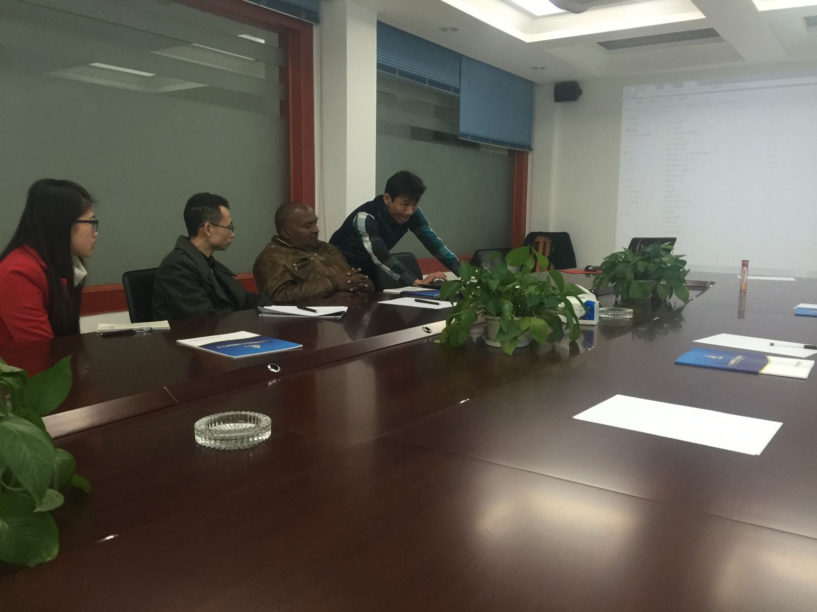 圖為客戶在會議室洽談,工程師Jason給客戶展示相關工程案例。