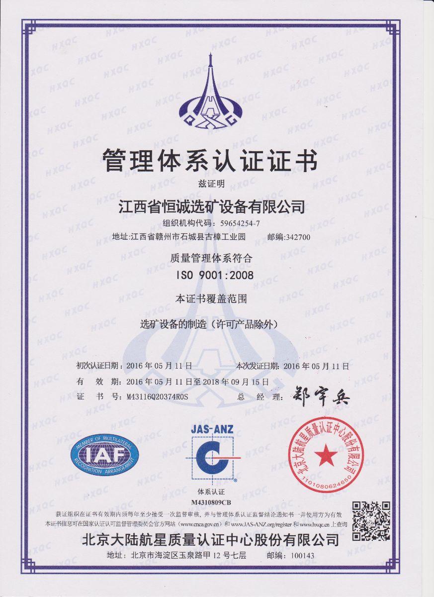 經過北京大陸航星質量認證中心股份有限公司BEIJING DALU HANGXING QUALITY CERTIFICATION CENTER CO.,LTD.的嚴格審核,公司榮獲國家認監委認可ISO9001:2008質量管理體系認證證書